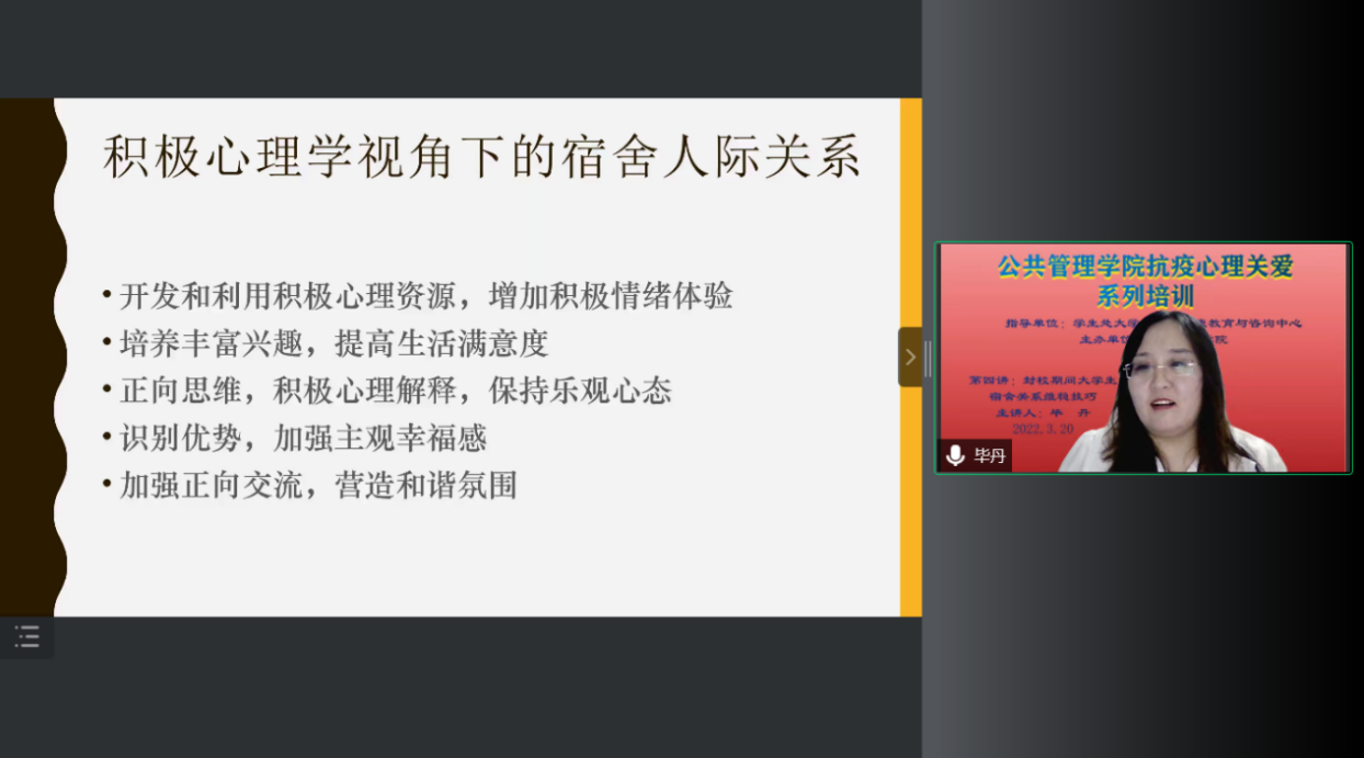 2022年3月20日晚,开云kaiyun官方网站举办首轮抗疫心理关爱系列讲座第四讲。本次讲座以“封校期间大学生宿舍关系维稳技巧”为主题,主讲人是社会工作系的毕丹老师。