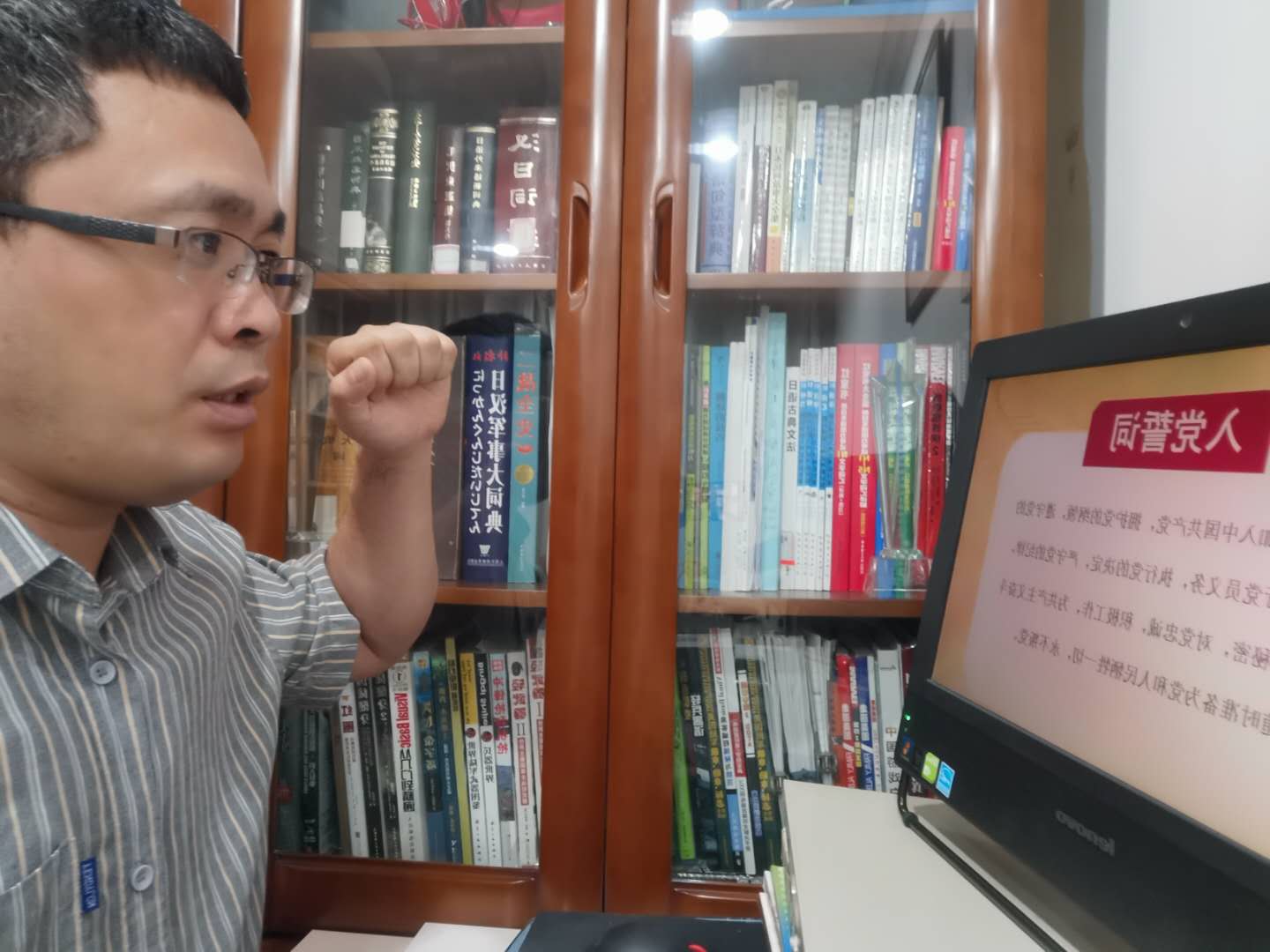 岁生日之际,通过重温入党誓词来回顾我们加入共产党时的庄严承诺,时刻提醒着自己肩负的神圣使命和责任,不断强化对我党的忠诚、担当意识以对共产主义事业不懈追求的信心。作为新时期的共产党员,我们可能不会有壮举或牺牲,但是立足于本职岗位,踏踏实实做好教书育人的教育工作,为群众服务、为学生服务,团结进取、勇于探索,把平凡的事情做好,也是我们对党和国家的贡献。