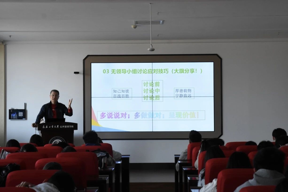 接着,在《面试深度讨论,如何体现价值——无领导小组讨论面试技巧》讲解环节中,李业旗教授凭借深厚行业经验,系统解析无领导小组讨论的流程架构与考核要素。他提出“讨论前“知己知彼,百战不殆”;讨论中把握关键、积极参与;讨论后“厚德载物,宁静致远””的三步策略,并分享论辩攻防技巧,通过大量实战案例对比,直观展现了无领导小组讨论规范与应对方法。