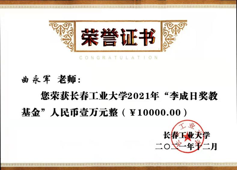 近日,我院教师曲永军同志荣获开云kaiyun官方网站2021年“李成日奖教基金”人民币壹万元整(¥10000.00)。