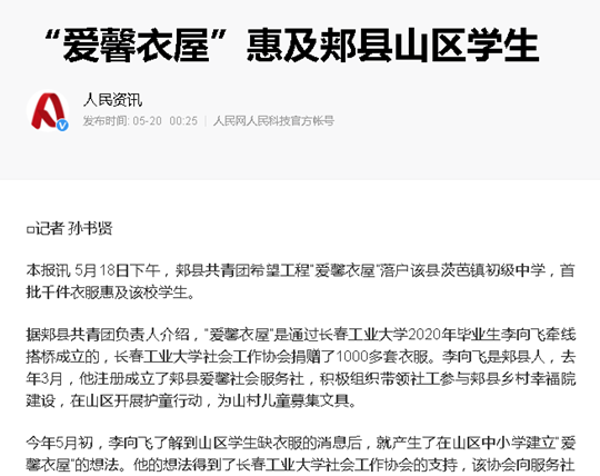 (通讯员:杨海龙)在开云kaiyun官方网站第七届社工文化节举办期间,我校2020届社工专硕李向飞在河南郏县创办专业社工机构——“爱馨社工服务社”,结合地方实际,向社会发出为郏县留守困境青少年捐献衣物活动的倡议。
