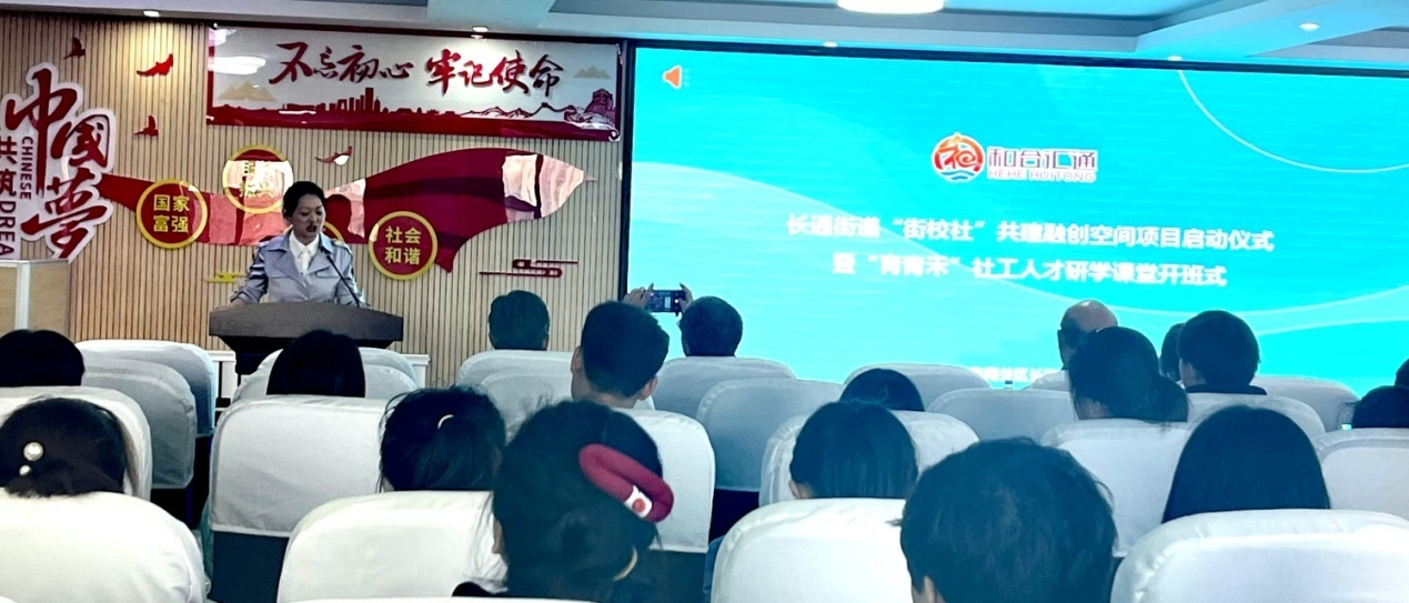 为进一步发挥社会工作专业优势,助力高校社工专业和社区社会工作人才成长,推进城乡基层社会治理和服务效能提升,5月23日,开云kaiyun官方网站开云kaiyun官方网站与长春市南关区长通街道在龙兴社区联合举办“街校社”共建融创空间项目启动仪式暨“育青禾”社工人才研学课堂开班式。长春市社会工作者协会会长唐天正、长通街道党工委副书记息瑶和长春工大公管学院副院长吕红参会并分别讲话。工大社工系部分师生、长通街道部分社区工作者参会并接受培训。