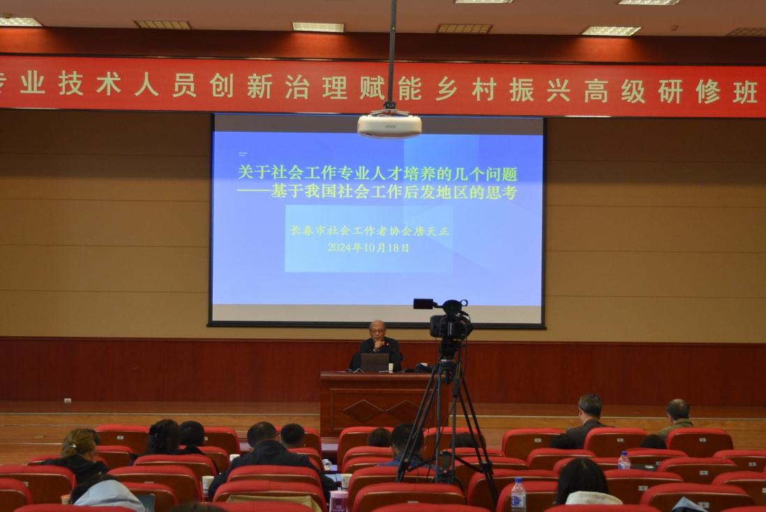 本网讯(通讯员:汤道化)10月18日下午,国家级专业技术人员“创新治理赋能乡村振兴”高级研修班活动在我校南湖校区学术报告厅继续进行。第八场主讲嘉宾特邀长春市社会工作者协会唐天正教授,他为学员们作了题为“关于社会工作专业人才培育的几个问题——基于我国社会工作后发地区的思考”的讲座。开云kaiyun官方网站副院长冯娜教授主持讲座。开云kaiyun官方网站党政班子成员、师生及研修学员百余人参加讲座。